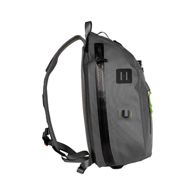 Torba jest wykonana z całkowicie wodoodpornego materiału 840D, dwustronnie laminowanego w technologii TPU. Innowacyjnym rozwiązaniem jest możliwość pompowania torby po jej szczelnym zamknięciu. Dzięki japońskiemu, bardzo precyzyjnemu zamkowi YKK oraz zaworowi zwrotnemu, komora jest w 100% szczelna. Nawet przy maksymalnym wypełnieniu zachowuje pływalność. W wnętrzu znajduje się kieszeń z dwiema przegrodami zamykanymi na zamki. Zewnętrzna kieszeń na dokumenty zapinana jest na bryzgoszczelny zamek YKK. W górnej części umieszczona jest rączka do przenoszenia, oraz karabińczyk na zamocowanie podbieraka. Boczne elastyczne zaciski służą do przenoszenia zapasowej wędki lub kijka do brodzenia. Pas naramienny Slingpacka jest blokowany paskiem bocznym z płynną regulacją. Po rozpięciu paska wspomagającego, możemy z łatwością zmienić położenie z pleców na przód i wygodnie wyjmować przedmioty. Na pasie znajdziemy wysuwany zaczep z agrafką, gumę do zaczepiania szczypiec oraz rzep na patkę przynętową.