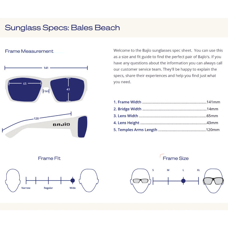 Model Bales Beach to okulary typu wrap-around z dodatkowymi panelami bocznymi, zapewniającymi większą ochronę. Oprawki wykonano z opatentowanego, bio-bazowanego nylonu, dzięki czemu są lżejsze i bardziej trwałe. Soczewki dostępne są w sześciu kolorach, wszystkie z polaryzacją i technologią LAPIS™, która blokuje 95% światła niebieskiego, a dodatkowo mają trwałe powłoki antyrysowe i oleofobowe.