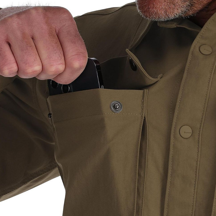 - Dwie kieszenie na piersi typu bellowed z gumowanymi napami zapewniają przestrzeń na akcesoria; lewa kieszeń ma specjalny schowek na okulary przeciwsłoneczne.