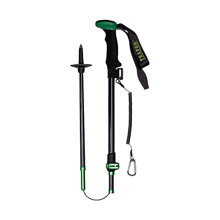 Konstrukcja tego kija oparta jest na wysokiej klasy, lotniczym aluminium. Dzięki temu stopowi uzyskano optymalną wagę 286 gramów. Wytrzymała rączka z pianki EVA, zakończona pętlą, gwarantuje pewny chwyt. Na dole umieszczono antypoślizgowy, widiowy bolec, dodatkowo znajdziemy gumową nakładkę oraz talerzyk z tworzywa. Elementy kijka połączone są mocną powlekaną linką. Rozkładanie odbywa się poprzez rozciągnięcie do momentu automatycznego zablokowania. Na górnej części znajdziemy podziałkę w centymetrach i calach. Umożliwia to szybkie dopasowanie długości do wzrostu. W komplecie znajdziemy nakładkę gumową, talerzyk z mocnego tworzywa oraz neoprenowy pokrowiec. Doczepiana linka z karabińczykiem zapobiega zgubieniu kija.